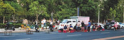 晚上7时左右,记者发现公园贵阳路出口的马路上又摆放了六七张铁艺桌子,被红色塑料凳围着,占据着车辆通行的路面。不一会儿工夫,其中的3张桌前就坐满了人,牌局还引来不少围观的人,过往路人只能绕道通行,对道路交通安全造成严重影响。一位牌摊老板说,公园里夜间照明不足,他们才将牌桌搬到马路上来的。